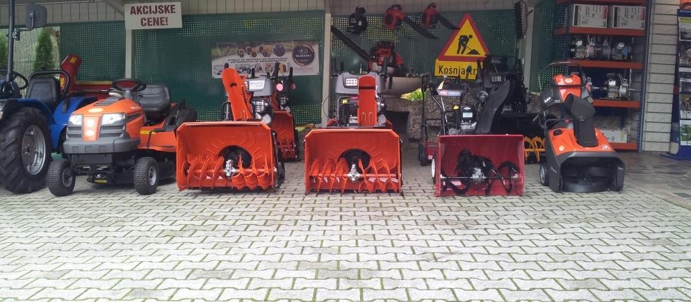 traktorje – kmetijske in komunalne, motokultivatorje in priključke, kosilnice, mulčarje, snežne pluge in rolbe, vrtne traktorje in raiderje, agregate, sesalce in pihalce listja, vodne črpalke, laksarice, motorne škarje za živo mejo, motorne žage Husqvarna, nadomestne motorje in vse rezervne dele.